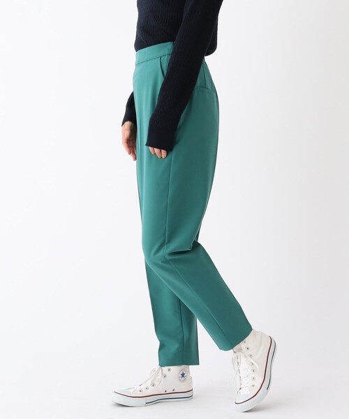 クリーンな素材感とマルチな機能性、そして美しいシルエットにこだわったテーパードパンツ 【デザイン】 ・レッグラインをきれいに魅せる、こだわりのテーパードシルエット ・やや深めのウエストで、タックを無くし、ウエスト周りのサイズ感をスッキリとほどよくタイトに ・ウエストのタブを長めにし、シンプル過ぎないポイントに。トップスインでもOKのデザイン ・センタープレス入りでよりキレイなラインを強調 ・ジャストレングス設定で、足元を選ばずに着用可能 ・ウエストバックはゴム仕様ではき心地も快適 ※ポケット数:横×2 後×2 【素材】 ・ウール混の本格的かつクリーンな表情が特徴のトロピカル素材 ※トロピカル:細番手の糸を平織りにして、クリアな表情を持つ布帛(フハク)素材・強撚(強く撚る)の糸を使用することで、さらっとドライなタッチと、密度の高い美しい表面感が魅力 ・ストレッチが効いているのではき心地も快適 ・シワになりにくく、取り扱いの簡単なイージーケア ・ご家庭でのお洗濯が可能です ※裏地なし ※サンドベージュ(053)はやや透け感があるため、インナーの着用をおすすめします。 ※WEB限定サイズ:34(SS),42(LL) こちらの商品は主に秋に着用いただける商品です。 モデル情報:身長165cm B84 W62 H89 着用サイズ:38(M) 店舗へのお問い合わせ商品番号:637-65037 ●製品寸法: 34(SS):W62~66cm H82cm 股下63cm 前股上33cm 渡り幅28cm 裾幅14cm 36(S):W65~69cm H85cm 股下63cm 前股上33cm 渡り幅29cm 裾幅14cm 38(M):W68~72cm H88cm 股下64cm 前股上33cm 渡り幅30cm 裾幅15cm 40(L):W71~75cm H91cm 股下65cm 前股上34cm 渡り幅31cm 裾幅16cm 42(LL):W74~78cm H94cm 股下66cm 前股上34cm 渡り幅32cm 裾幅17cm 備考: