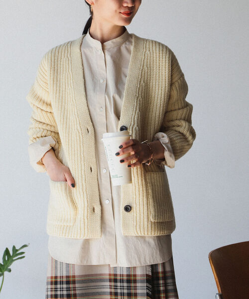 大人の抜け感を演出 極太のウール100%糸を使用したカーディガン。染料を使わずにそのままの色を使ったエコな素材です。 立体感のある畔編みで、ふっくらと厚みを感じることのできる仕上がり。コートシーズンに入る前に軽いアウター感覚で着用できる1枚です。ウエストをベルトマークして着こなすのもおすすめです。 【OFF_WHT】Model:H162 B78 W57 H82 Size:FREE 【D.BROWN】BEAMS STAFF:H160 Size : FREE *********************** 洗濯:ドライクリーニング 生地の厚さ:厚手 透け感:なし 伸縮性:あり 光沢感:なし 裏地:なし *********************** 【スタッフレビュー】 Demi-Luxe BEAMS スタッフ 身長:158cm / 普段サイズ:36 / 着用サイズ:FREE サイズ感: 袖は長めで程よくゆるっと着られるサイズ感。 素材感: チクチクせず、ストレスフリーで着られます。地厚なので暖かく着られます。 ポイント: 絶妙な色味でコーディネートに溶け込みやすいです。 Demi-Luxe BEAMS スタッフ 身長:158cm / 普段サイズ:36 / 着用サイズ:FREE サイズ感: 袖は少し長めで、ゆったりと着る事が出来ます。 素材感: ふっくらと厚みのある生地で柔らかくチクチク感は気になりません。 ポイント: ボリュームある袖が可愛らしいです。着るだけで抜け感が演出できます。 Demi-Luxe BEAMS スタッフ 身長:150cm / 普段サイズ:36 / 着用サイズ:ONE SIZE サイズ感: 抜け感のあるゆったりとしたざっくりニットです。 素材感: 厚手で暖かな素材感です。あぜの凹凸感が豊かなニットです。 ポイント: ゆっとりとしたサイズ感とフロントポケットがポイントです。 ※光の当たり具合やパソコンなどの閲覧環境によって実際の色味と異なって見える場合がございます。予めご了承ください。 ※商品の色味は商品単体で撮影した画像をご参照ください。