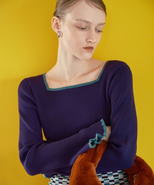 デコルテが綺麗に見えるスクエアネックリブニット。襟ぐりと袖口のフチをバイカラーにして、アクセントを効かせています。身頃はシンプルなシルエット、袖はフレアスリーブにしてデザイン性をプラス。キレイめスカートやパンツ、デニムカジュアルも楽しめます。