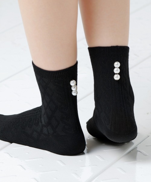 バックにパールを飾ったガーリーなソックス。 あたたかみのあるケーブル編みで可愛さアップ♪ 短めの丈感で、スニーカーやローファー、パンプスと、どんなシューズとも相性抜群。 手軽に足元のオシャレ度を高めてくれるアイテムです。 ※サイズにつきましては若干の誤差が生じる場合がございます。予めご了承ください。 ※注意:色の違うものと一緒に、長時間洗濯液につけないで下さい。 品番:270-124-7938