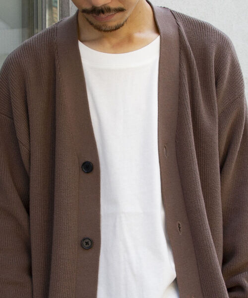 柔らかなタッチのポリエステル糸を3本取りのハイゲージで編み上げ、適度なハリと伸縮性を兼ね備えたニット生地を採用したロンT付きのカーディガン。 優しい凹凸感のあるアゼ編みは、程よいハリ感のあるソフトな着心地が特徴です。 ニット特有のチクチクした肌触りを一切排除し、吸湿性が高く、保湿性があるところも嬉しいポイント。 肩回りを包み込むようなドロップショルダー、ゆとりのある身幅、抜け感のあるビッグシルエットが目を引く存在感抜群のニットカーデ。 付属のロンTにデニムのスタイルにさっと羽織るようなカジュアルスタイルや、スラックスに合わせたきれいめモードスタイルなど、カーゴパンツ、スケーターパンツなどボトムスを選ばない幅広いコーディネートに対応が可能です。 ※プルオーバータイプ(品番:2-0091-6-52-002)の展開もございます。 【GLOSTER/グロスター】 『男性であること、女性であること、日本人であること、人間であること。』 自由に生きる為に必要な洋服であり、着る人を主体と考えたプロダクトを提案します。 普遍的な洋服の礎であるワーク・ミリタリーをベースにエッセンスとして艶を加えて形にします。 洋服の原型を生かしながらもひねりの効いた素材を使い、ディテールは歴史の焼き増しではなく新たな価値観を創造します。 ※お取扱い上のご注意 アテンションタグを必ずご確認の上、着用又はお取り扱いください。 ※店頭及び屋外での撮影画像は、光の当たり具合で色味が違って見える場合があります。 ※商品画像に関しては出来る限り忠実に表示出来るよう努めておりますが、お客様がご利用のモニターの設定及び特性により、実際の商品と比較し色味に若干の誤差が生じる場合があります。 ※画像の商品はサンプルとなりますので実際の商品と仕様、加工、サイズが若干異なる場合がございます。 ◇商品のお気に入り登録◇ 【お気に入りに登録】を是非ご活用ください。 再入荷の通知や、ラスト1点の通知、セールの通知がいち早く届きます。 ◇ブランドのお気に入り登録◇ 新商品や再入荷など、いち早くブランドのお得情報が届きます。