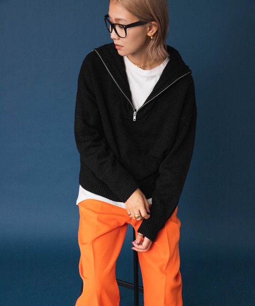 色んな着回し出来る優秀ハーフジップニット!【Design】フロントにジップを施したカジュアルな印象のニット。ボリューム感があり1枚でスタイリング映えするニットです。襟部分は二枚仕立てにしているのでジップを閉じると、しっかりしたハイネックに。ジップを開けても、くたっとならずに綺麗に開きます。またジップまわりをリブ仕様にすることでペタッとならず表情が出るので、シンプルながらも1枚で様になるアイテムです。【Material】アクリルのニットで、ざっくりとした編地がカジュアル感を演出します。 程よい厚みと、柔らかさが着心地が良く、やみつきに。【Coordinate】インナーにはカジュアルなカットソーをレイヤードしてミックス感のあるスタイリングがオススメ。今年はカラーハイネックをインナーにレイヤードしてこなれ感抜群な着こなしも○よりカジュアル感のあるスタイリングでまとめる場合はデニムで王道なスタイリングを。タックパンツを合わせるとシティ感ある印象に。スカートとサイドゴアブーツと合わす、少し女性らしいスタイリングがおすすめ◎※ご覧のモニター環境により、画像の色味と多少異なる場合がございます。-----------------------------透け感:ほぼなし生地の厚さ : 普通伸縮性 : あり裏地:なし光沢:なし洗濯:手洗い推奨-----------------------------※詳しいお手入れ方法は商品タグをご参照ください。【お買い物をよりお楽しみいただく為に】▼商品のお気に入り登録をおすすめします♡をクリックしてください。完売カラーの再入荷や、ラスト1点の通知、セールの際の通知を受ける事ができます。ブランドのお気に入り登録もご一緒にお願い致します。
