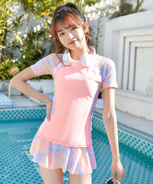 レディース フィットネス水着 Fitness 2SET 2colors FITNESS 海やプールでの レジャーでは勿論。 ジムでのアクアフィットネス 水中ウォーキング等にも! ・お洒落に体型カバー ・動きやすい!伸縮性あり! ・シーンを変えて マルチに使える! check point POINT.1 切り替えデザインが 可愛いラッシュガード POINT.2 お洒落な柄入りの袖部分は 涼し気メッシュ素材! POINT.3 肩は見せない! 半袖で着やすく日焼け対策! POINT.4 お腹をしっかり隠して 気になる体型をカバー POINT.5 スカート一体型のパンツで 動きやすさがGOOD! Detail 嬉しい!パッド付き ブラパッドがついている! 届いたらすぐ使えるから 準備もらくらくHAPPY パッドの追加OK もっと盛りたい方必見!! パッドポケットがついて いるからお手持ちの パッドの追加ができる! ノンワイヤー ワイヤーが苦手な方に 動いてもあたらないから 快適な着心地 アンダー2段階調節可 体型に合わせて調節! 動きやすくしっかりフィット! 安心ショートパンツ めくれても露出は抑える 嬉しいショートパンツ! MODEL Mサイズ着用 身長:162cm バスト:80cm ウエスト:65cm ヒップ:82cm 体重:46kg photogenic お洒落して思い出を SNSに残そう! #TeddyShop #ビーチファッション #水着 #海 #プール 【商品詳細】 ・パッドポケットあり(パッド付き) ・ワイヤーなし ・肩ひも取り外し不可 ・肩ひも調節不可 ・アンダー調節可 【セット内容】 ・2点セット ・ブラ一体型トップス ・スカート付きショートパンツ ●サイズ表をご確認の上、お間違いのないようご購入下さい。 ●サイズは平置きで測定したサイズです。 ※身幅は脇の下から2.5cm下の幅をまっすぐに測定したサイズ、 ウエストは履き口幅を測定し、2倍にしたサイズです。 ※サイズは、実寸サイズを測っているため多少誤差がでる場合があります。 製造工程の関係上、各採寸箇所実寸(平置き)より【約-3cm~+3cm】程度は 誤差の許容範囲とさせて頂いておりますので、予めご了承くださいませ。 水着は水分を含むとサイズ感に余裕が出る作りとなっておりますので、多少小さ目の作りとなっております。 ●商品・着用者によっては多少の誤差がある場合がございます。 ●商品のお色は、照明の関係で実物と多少の違いが生じることがございます。ご了承ください。 ●生地の取り方により、柄の位置等写真と異なる場合がございます。ご了承ください。 洗濯:手洗い可 パッド有りです。 ※当該商品は衛生商品のため、基本的に初期不良品以外の返品/交換については対応対象外となっております。予めご了承下さいませ。