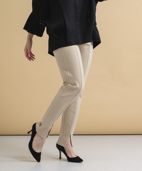 センタースリットが旬な、着映えストレッチパンツ。 ○POINT ・ポリウレタン5%混で伸縮性が良く、穿き心地快適です。 ・センターはプレスではなく切替になっており、縦見え効果も。 ・すっきりとしたシルエットできれいめにもカジュアルにもお召いただけます。 ・年代問わず着られて、着回し力にも優れた大人のマストアイテムです。 ○STYLING ・シャツやブラウス、ジャケットと合わせればすっきりシルエットのお仕事スタイルに。 ・ビッグTやチュニックと合わせれば、快適なカジュアルスタイルに。 裏地:なし 光沢:なし 伸縮性:あり 透け感:なし 生地の厚さ:普通 ポケット:あり