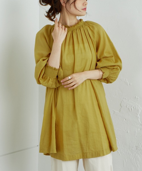 ピュアルセシン 2022 SS collection【classical fragrant】 ◇長いシーズン活躍するシャーリングブラウス◇ ●商品のお気に入り登録 クーポンやタイムセール、再入荷通知やラスト1点などお得な情報を受け取ることができます。 ご登録をお忘れなく◎ ●デザイン 前後着用が可能な、シアーブラウス。 袖口と首元に入ったシャーリングでフェミニンに仕上げ、秋冬のレイヤードスタイルにオススメしたい1着。 サマーシーズンには1枚での着用は勿論、ボタンを開け軽い羽織りとしても活躍します。 着丈は腰周りをしっかりカバーするチュニック丈なので、安心です。 ●カラー展開 ライトベージュ/マスタード/チャコールグレーの3色展開幕 ●素材 コットンとラミーが半々になった軽い素材感。 ドライタッチで涼し気です。 ●スタイリング 着丈が長めなので、パンツスタイルがオススメ。 キャミソールインナーの上にバサッと羽織るコーディネートや柄アイテムを1つプラスすると、一気にトレンドライクに仕上がります。 秋冬にかけては、セーターやスウェットとレイヤードし、袖口と首元を覗かせたスタイリングがオススメです。 =============================== 透け感:あり 裏地:なし 伸縮性:なし 光沢感:なし 生地の厚さ:薄手 【スタッフコメント】 年齢:20代前半/身長:157cm/普段着用サイズ:Mサイズ サイズ感:身体の泳ぐ、締め付け感のない着心地です。ゆとりがあり、通気性も◎ 素材感:重さを感じることなく着用できます。ラミー混じりの涼し気な1着。 =============================== ※撮影場所やお使いのモニター環境により若干お色味が異なる場合がございます。特にロケの撮影では明るく見える傾向にございます。 ※予約商品はサンプルで撮影をしております。若干の仕様が変更になる場合がございますので予めご了承の上ご注文くださいますようお願いいたします 。