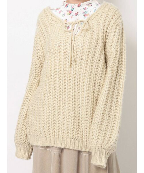 〇 LOOK use ITEM 〇 ざくざくと編み立てられたローゲージニットには、 さりげないリボンを添えて。 涙開き仕様で、 ゆったり着崩したい時にはリボンで結ばずにたらんと垂らしても◯ そのまま着ても、 ブラウスやタートルニットをレイヤードしても。 甘くなりすぎず、 ちょっぴり大人に着られる1着です。
