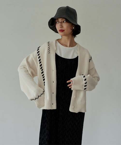 ・アシンメトリーな、配色ステッチデザインが目を引くカーディガン。・太めのステッチ、細めのステッチ、ジグザグのステッチと3種類のステッチにこだわった1枚。・中肉の程良い厚みのある生地を使用しているのもポイント。・ゆるっとした太めの袖が抜け感をプラス。・どんなコーディネートにも羽織りやすい程良い着丈。・Vネックで顔周りもスッキリと見せてくれます。※当商品は機械による生産の過程上、どうしても"生地を織る際の糸の継ぎ目"や多少の"ほつれ"、他繊維の"混紡"、また、形やサイズや柄に多少の"誤差"が生じる場合がございます。※サイズは、実寸サイズを測っているため多少誤差がでる場合があります。製造工程の関係上、各採寸箇所実寸(平置き)より【約-3cm~+3cm】程度は誤差の許容範囲とさせて頂いておりますので、予めご了承くださいませ。※メーカーより密封状態で入庫し、検品時に再度袋詰めを行っておりますが、素材により染料等の臭いが強い場合がございます。※発送上の状態によって商品がシワになる場合がございます。※商品により色落ち・色移りがある場合がございますので、品質表示をご確認の上、お取り扱いにご注意くださいませ。【生地】やや厚みのあるしっかりしたニット生地【伸縮性】あり【透け感】淡色に多少あり【裏地】なし
