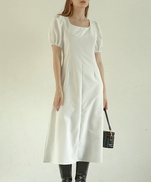 【着用シーン】 結婚式・二次会・披露宴・お呼ばれ・成人式・同窓会・女子会・セレモニーな場所や、 謝恩会・パーティー・デート・演奏会・発表会など多様なフォーマルなシーンに大活躍してくれます。 ■デザイン バックタイデザインがポイントのロングワンピースです。 程よくボリュームのあるパフスリーブと、緩やかに広がるAラインシルエットが女性らしい印象に。 首元をスクエアネックにすることで、顔周りはシャープな印象に仕上げました。 バックジップでの着脱仕様です。 下着が見えない位置での肌見せなので、インナーを気にせず着用できるのも嬉しいポイント。 ■素材感 ふんわりと軽いコットン素材です。 ホワイトはやや透け感があるので、ペチコートを合わせての着用 もしくは同色系やベージュのお下着での着用がおすすめです。 ■スタイリング 夏場は一枚でさらりとサンダルを合わせて、 秋口にはインナーにハイネックトップスやブーツ、ジャケットを合わせて 様々なスタイリングをお楽しみ頂けます。