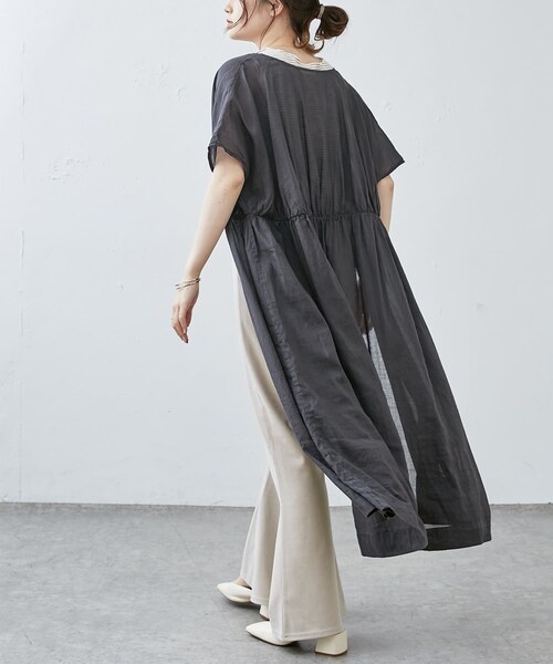 ピュアルセシン 2022 SS collection【classical fragrant】クラシカルな雰囲気を纏いながらも新しく今シーズンらしい香を漂わせたクリアで洗練されたスタイリング◇前後で着用できる、清涼感あるラミーワンピース◇●デザイン前後着用が可能な、シアーワンピース。コットンとラミーの混合素材で、シーズンムードを高めてくれます。ウエストに寄ったギャザーから生まれるドレープは滑らかな動きを作り出し、女性らしいシルエットを演出。ボタンを全て外し、軽い羽織りとしての着用やパンツ合わせで、カジュアルダウンしたスタイリングまで、様々な着こなしをお楽しみいただける1着です。●カラー展開ライトベージュ/マスタード/チャコールグレーの3色展開●素材コットンとラミーが半々になった軽い素材感。ドライタッチで盛夏の活躍が見込めます。●スタイリングパンツを合わせたスタイリングがデイリーユースにオススメ。ロゴTやキャミインナー、タンクなどにバサッと羽織るコーディネートはシーズンライクな仕上がりに。スタンダードなライトベージュやチャコールグレー、アクセントになるマスタードまでカラーを揃えているので、是非気になる1着を見つけてみて下さいね。===============================透け感:あり裏地:なし伸縮性:なし光沢感:なし生地の厚さ:薄手【スタッフコメント】年齢:20代前半/身長:157cm/普段着用サイズ:Mサイズサイズ感:身体の泳ぐ、締め付け感のない着心地です。ゆとりがあり、通気性も◎素材感:重さを感じることなく着用できます。ラミー混じりの涼し気な1着。===============================※撮影場所やお使いのモニター環境により若干お色味が異なる場合がございます。特にロケの撮影では明るく見える傾向にございます。※予約商品はサンプルで撮影をしております。若干の仕様が変更になる場合がございますので予めご了承の上ご注文くださいますようお願いいたします。