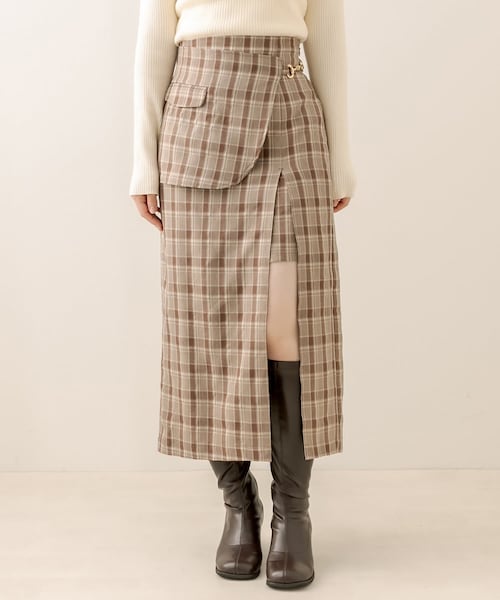 アシンメトリーのラップデザインがポイント■デザイン・ラップデザインとビットベルトが目を惹くIラインスカート。・深めのスリット入りで抜け感をプラスし、女性らしい印象に。・ラップの部分はサイドのボタンで取り外し可能。その日の気分に合わせて着こなしが楽しめます。・サイドはファスナー付きで、タックインも決まるスッキリとしたウエストラインです。■カラー・ブラウン(チェック柄)/チャコール(ストライプ柄)/ブラック(無地)/ダークブラウン(無地)の4色展開■スタイリング・トレンドのシアートップスや肌見せトップスで合わせればレディライクに。・秋はファーベストを合わせても可愛いです。・足元は今年らしくサイドゴアブーツやロングブーツで合わせるのがおすすめ。・ワントーンでまとめたコーディネートも◎-----------------------------裏地:あり光沢感:なし透け感:なし伸縮性:なし-----------------------------model:153㎝/166cm お取り扱い上の注意※キャンペーンやフェアにより価格が変動する場合がございます。※サンプルで撮影している為、実際の商品と若干仕様が異なる場合がございます。※着用、お取り扱いの際は、商品についている品質表示とアテンションタグを必ずご確認下さい。※ご覧のモニター環境や撮影環境により実際の商品と多少色味が異なって見える場合がございます。ご理解の程よろしくお願いいたします。≪返品・交換について≫・着用後、洗濯後の返品・交換は致しかねます。・商品到着後、着用前に商品状態のご確認をお願い致します。登録のおすすめ【気になるアイテムをお気に入り登録】・お気に入り登録した商品はメニューの「♡お気に入り」ボタンから、一覧表示することが出来ます。・完売商品の再入荷やラスト1点の通知、セールの通知を受け取ることが出来ます。パソコン(iPad)の場合・・・「カートに入れる」ボタン横に表示されている「♡」をクリックしてください。スマートフォンの場合・・・商品画像右上に表示されている「♡」をタップしてください。【PALCLOSETアプリのブランドフォロー】・新商品やお得な情報をいち早くcheckする事が出来ます。・スタッフのコーディネートをお楽しみ頂けます。