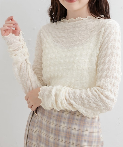 ぽこぽことした立体的なフォルムが可愛いインナー。■デザイン・1枚で着てもコーデが決まる、今年らしいぽこぽこした生地のトップス。・立体的なフォルムでやわらかくエアリーな着心地がポイント。・袖口はくしゅっとギャザー入りで女性らしさをプラス。・秋から冬のレイヤードコーデまでロングシーズンで着まわしできます。■カラー・オフホワイト/ブラックの2色展開■スタイリング・程よく透け感があるのでカップ付きキャミを中に着ると安心です。・ミニスカートで合わせてガーリーに。・デニムパンツでカジュアルな着こなしもおすすめ。・トレンドのキャミジャンスカのインナーとしても◎-----------------------------裏地:なし光沢感:なし透け感:ややあり伸縮性:あり-----------------------------model:162cm お取り扱い上の注意※キャンペーンやフェアにより価格が変動する場合がございます。※サンプルで撮影している為、実際の商品と若干仕様が異なる場合がございます。※着用、お取り扱いの際は、商品についている品質表示とアテンションタグを必ずご確認下さい。※ご覧のモニター環境や撮影環境により実際の商品と多少色味が異なって見える場合がございます。ご理解の程よろしくお願いいたします。※引っかけ注意・粗い組織のものや、表面に凹凸があってルーズな組織のもの表面に糸が浮き出ているものは、ちょっとした不注意から引っかけてしまいがちです。取り扱いの際は取り扱い絵表示確認の上、十分注意してください。・着用時にベルトや、バックや周囲の壁など表面の粗いものとの摩擦や引っかかりに注意してください。・水洗いやクリーニングの際にも他の物ものとの引っかかりに注意して下さい。≪返品・交換について≫・着用後、洗濯後の返品・交換は致しかねます。・商品到着後、着用前に商品状態のご確認をお願い致します。登録のおすすめ【気になるアイテムをお気に入り登録】・お気に入り登録した商品はメニューの「♡お気に入り」ボタンから、一覧表示することが出来ます。・完売商品の再入荷やラスト1点の通知、セールの通知を受け取ることが出来ます。パソコン(iPad)の場合・・・「カートに入れる」ボタン横に表示されている「♡」をクリックしてください。スマートフォンの場合・・・商品画像右上に表示されている「♡」をタップしてください。【PALCLOSETアプリのブランドフォロー】・新商品やお得な情報をいち早くcheckする事が出来ます。・スタッフのコーディネートをお楽しみ頂けます。y2k_220817