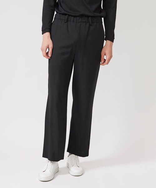 七分裏地仕様。ストレートシルエットのイージースラックス。<パジャマパンツをイメージして作成したウエストゴムの仕様でリラックスしたシルエット。ラフになり過ぎない様にサイドに共地パイピングで即章のようなデザインが特徴です。 ■素材■T/Wツイル ウールとポリエステルの混紡糸を使用した2/72ツイル。強撚糸により、しわになりづらく、ウォッシャブルでイージーケア。ドライな手触りで肌離れが良いのが特徴。