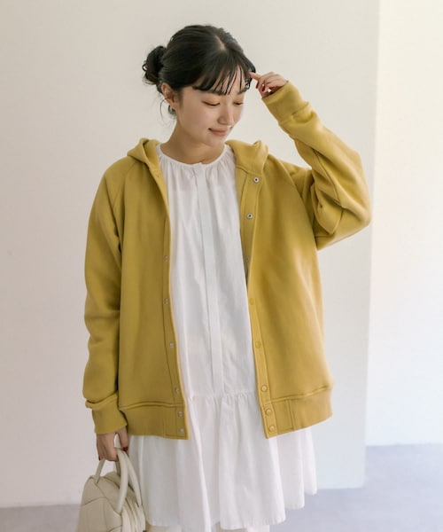ピュアルセシン 2022 AW collection【UNBLEACHED MILITARY】日々新たなニューノーマルが定着していく中でエッセンスとして今季はアーミーテイストを取り入れ変わらない美しさと上品な素材感を大切にし、洗練されたスタイリングの提案。◇裏起毛であたたか!こなれ感のあるフードブルゾン◇●デザイン程よくゆとりがあり秋の軽アウターとして重宝するフードブルゾン。フロントについたマットなスナップボタンがワンポイントに。お尻がすっぽり隠れる着丈で暖かさと安心感があります。レディライクにもカジュアルにも幅広くデイリーからお出掛けまで幅広いシーンで活躍してくれるブルゾンです。●カラー展開ベージュ/グレージュ/ブラック/イエロー/ピンク/ブルー系の6色展開。●素材ふっくらとした裏起毛素材。ストレッチが効いており、動きやすくなっております。ご自宅でお手入れしていただけます。●スタイリングレディライクなコットンスカートやワンピースカジュアルなデニムやカラーパンツなど、どんなアイテムにも相性が良いアイテム。おうちじかんにも、ワンマイル~タウンウェアとしても活躍します。===============================透け感:なし裏地:なし伸縮性:あり光沢感:なし生地の厚さ:厚手【スタッフコメント】年齢:20代半ば/身長:154cm/普段着用サイズ:Mサイズサイズ感:程よくゆとりがあるので低身長でもスッキリと着用できました。素材感:ふっくらした厚手の裏起毛で暖かい着心地です。===============================※撮影場所やお使いのモニター環境により若干お色味が異なる場合がございます。特にロケの撮影では明るく見える傾向にございます。※予約商品はサンプルで撮影をしております。若干の仕様が変更になる場合がございますので予めご了承の上ご注文くださいますようお願いいたします 。