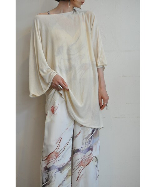 最高級と言われる、シルクリネンの紡績糸を使用し、シームレス(縫製がない)で作られたトップス。 ゆったりめのサイジング、優しい肌触りで快適な着心地。 2本針で編んだ少し薄手の生地感。 シームレス縫製の為、端の糸は敢えて残しています。 気になる場合はカットして下さい。 生地の特性上、所々にシボがあります。