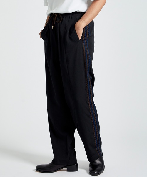 素材・エスウールと呼ばれる梳毛調合繊の糸を使用したトロピカル素材・ドライタッチで程良いとろみと光沢感がありながらも、高密度に織りあげることで、メンズに適したハリコシも・ストレッチ性があり、シワになりずらく、ご家庭で手洗いすることも可能透け感:なし裏地:なし伸縮性:なしデザイン・サイドのラインが特徴的なトラックパンツデザイン・2 配色のウェーブラインを組み合わせることで他にはないデザイン・ウエストは平ゴムとドローコードを通したイージー仕様・身頃中心部分にはあえて切替を作ることで、センタープレスのようなクリースラインを表現・梳毛ウールのようなトロピカル素材を採用することにより、スラックスのような上品さをプラスメーカー品番TPM22305001TAUPE大人に向けた、個性を発揮する為の日常着大人=保守的という固定観念に捉われずに、自由な発想で個の主張やスタイルを持ち続ける為のリアルクローズジャストスタンダードではなく、日常に溶け込む趣向品を目指しています。--------------------------------------------【お買い物をよりお楽しみいただく為に】▼商品のお気に入り登録をおすすめします。♡クリックしてください。完売カラーの再入荷や、ラスト1点の通知、セールの際の通知を受ける事ができます。ブランドのお気に入り登録もご一緒にお願い致します。