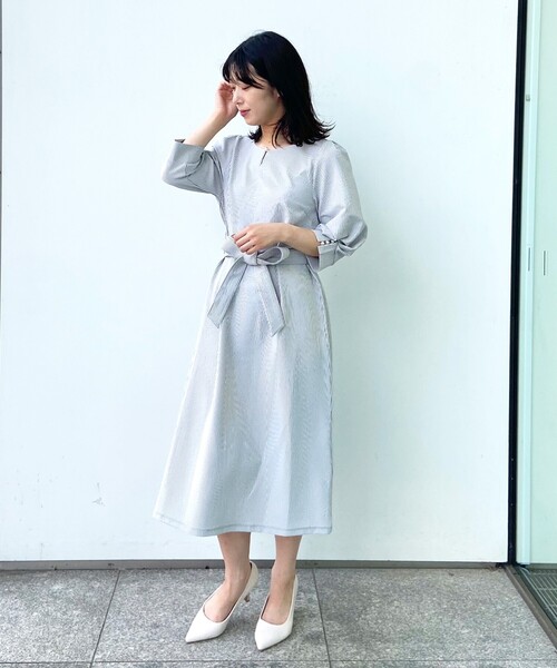 ------------------------------------------------- ▼ お気に入り登録 1,500人突破!------------------------------------------------- 汗ばむ時期におすすめ!シアサッカー素材の涼しげワンピース 【素材】 ・シボのような凹凸感のあるサッカー素材を使用。 ・通気性が良く、肌に触れる表面積が少ないので、さらりと着られます。 ・透けにくい表面感がある素材なので裏地なしでも安心、軽やかな着心地です。 ・マシンウォッシャブルでご自宅でのお手入れも簡単、しわも気にならない素材です。 ※裏地なし 【デザイン】 ・サッカー素材特有の風合いにストライプ柄のジャカード織がポイント。 ・さりげないキーネックに、大きめ一粒のフェイクパールが印象的。 ・ボリュームタックスリーブの、袖口にもパールをあしらっています。 ・長めのひじ下丈が季節の変わり目にぴったり。 ・ボディーに程よくフィットしつつ、共地のベルトでウエストマークするとスタイルアップ効果が期待できます。 ※ポケットなし ※36(S)・42(LL)サイズはWEB限定サイズ こちらの商品は主に秋に着用いただける商品です。 モデル情報:身長163cm B81 W56 H82 着用サイズ:38(M) 店舗へのお問い合わせ商品番号:C58-55006 ●製品寸法: 36(S):総丈107cm B92cm 袖丈39cm 肩幅32cm 付属ベルト全長169cm 付属ベルト幅3cm 38(M):総丈108cm B95cm 袖丈39cm 肩幅33cm 付属ベルト全長172cm 付属ベルト幅3cm 40(L):総丈111cm B98cm 袖丈40cm 肩幅34cm 付属ベルト全長175cm 付属ベルト幅3cm 42(LL):総丈111cm B101cm 袖丈40cm 肩幅35cm 付属ベルト全長178cm 付属ベルト幅3cm 備考: