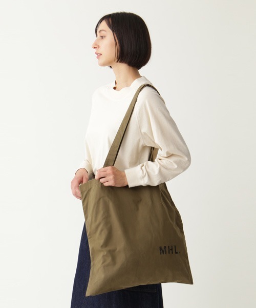 マチの無いシンプルなデザインだが、短くも持てるように持ち手がついている2WAY仕様のバッグ。短い持ち手の裏には、ウエアのディティールでも度々使われている杉綾テープを使用。 ※製品洗いをしていますので、多少の個体差があります。 ※こちらはMHL SHOP限定の商品です。 ※購入はお一人様一点限りとさせていただきます。