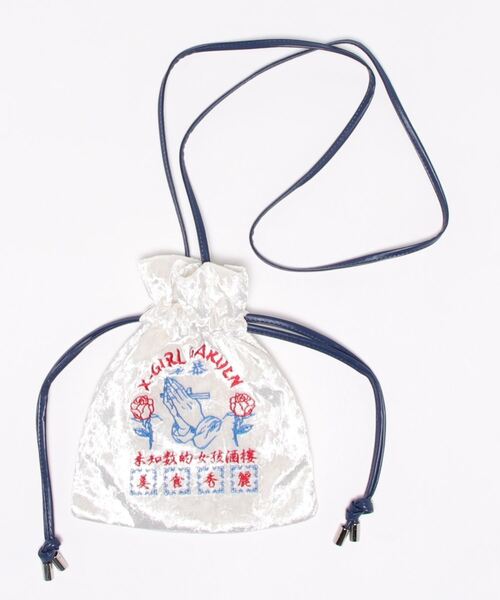 チャイニーズテイストの刺繡が新鮮な巾着バッグベロア素材が高級感のあるミニショルダーバッグ。グラフィックが目を惹く巾着バッグは、存在感がありコーディネートのアクセントになります。ポーチとしても使用しやすいサイズ感です。【仕様】メイン開閉部:巾着タイプポケット:無し