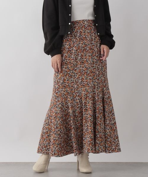 ■素材特性■ 経糸に甘撚糸、横糸に強撚糸を使用したデシン素材です。 ■デザイン■ フレアー分量を多めに入れて動きのあるフレアーマーメイドスカートにしました。 ウエスト周りはスッキリ見えるようになっていいるので太って見えず長めのトップスとも合わせやすくなっています。 ■スタイリング例■ ボカシ花がポイントのマーメードスカートです。 多色使いの柄スカートなのでスタイリングのポイントとして着用していただけます。 ミリタリーアイテムと合わせると今年らしいスタイリングを楽しめます。