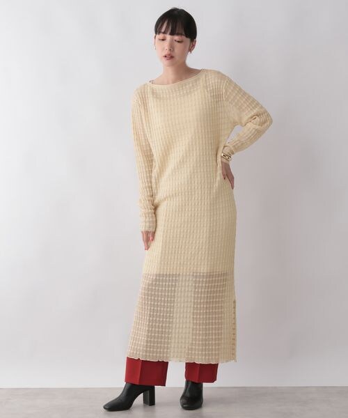 ーーー ■素材特性■ 縦見えで凹凸のある編地のシアーを加え、清涼感のある素材です。 薄手素材で伸縮性があるのが特徴です。 ■デザイン■ Iラインのストレートワンピースで大人っぽい雰囲気で着れるマキシ丈ワンピースです。 サイドにスリットが入っているので抜け感があるデザインになっています。 *インナーキャミソール付き ーーー ■スタイリング例■ シアーで透け感のある素材なので、パンツとのレイヤードスタイルがお勧めです。 インナーキャミソール付きなので、1枚でも着て頂けます。