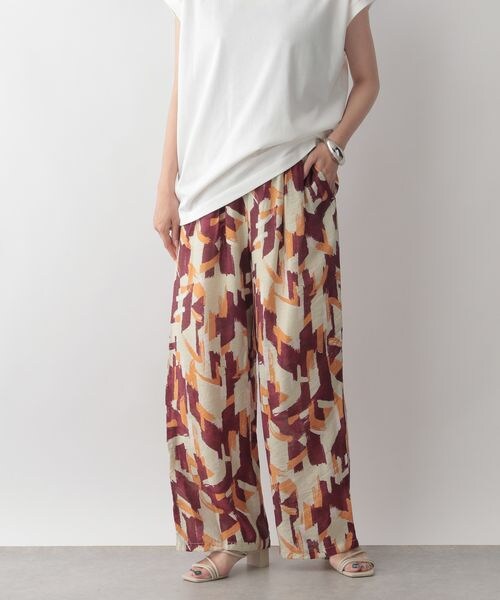 ーーー ■素材特性■ 細番手のレーヨンとハリ感のあるナイロンで光沢感を出した素材になります。 細番手のレーヨンを使用する事で落ち感のある、きれい目な表面感に仕上がっています。 ■デザイン■ 夏らしいペイント柄がかわいいリラックスパンツです。 薄手の素材なので盛夏でも涼しくはけます。 シルエットはワイドですが、落ち感のある素材で広がらず細見えします。 ーーー ■スタイリング例■ 夏らしい柄パンツなのでトップスには、メッシュノースリーブや羽織りシャツなどの軽さのある素材感のアイテムがオススメです。 同素材のトップスも用意しているので、SETUPでも着用していただけます。