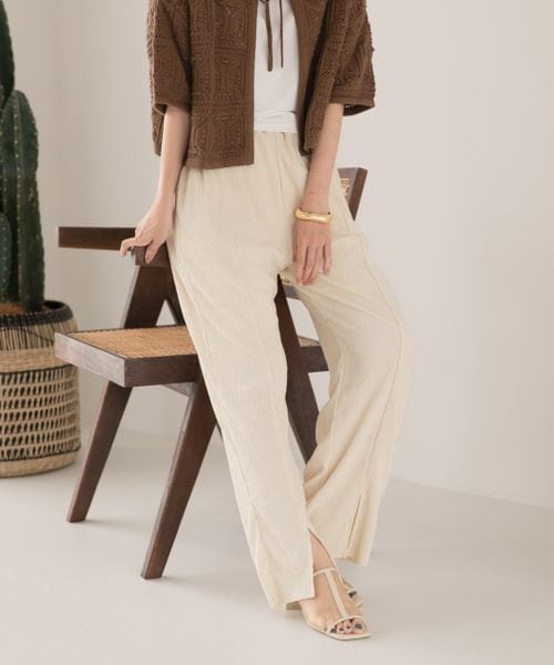 ーーー ■素材特性■ 光沢のあるスムース生地に細かいランダムなプリーツ加工を施した素材です。 適度な伸縮性とさらっとした肌触りが特徴で、シワになりずらくお手入れ簡単な素材です。 ■デザイン■ 寒い時期まで長く穿けるようにほど良い肉厚さの素材にプリーツ加工を施したパンツです。 プリーツも細かめの凹凸の少ないプリーツなのでコーディネートもしやすいです。 センタースリットが抜け感のあるデザインポイントになっています。 裾から5センチまでセルフカットしていだだけます。 ーーー ■スタイリング例■ チュニック丈のシャツやブラウス合わせはもちろん、トレンドのベスト合わせが今年らしくオススメです。