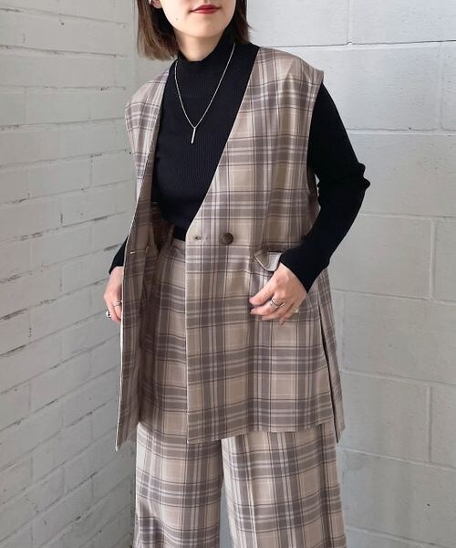 ーーー マニッシュな雰囲気が秋にぴったりなチェック柄ジレベスト 生地はページボーイオリジナルで作成した先染めのチェック柄。 すっきりとしたノーカラーが映えるシンプルなデザインがポイント ヒップにかかるミドル丈と、深めに入ったサイドスリットで抜け感のある着こなしが叶います。 ーーー シンプルなカットソーはもちろん、シャツ・ブラウス等のキレイ目なトップスとも相性◎ カジュアルなパンツやロングスカート、ワンピースまで様々なアイテムとレイヤードしやすく着回しの効く一着。 同素材でお作りしたボトムと合わせたセットアップスタイルのおすすめです。 ▼セットアップ対応アイテム チェックワイドパンツ 〈注意事項〉 ・サンプルにて撮影をしておりますので、実際の商品とは素材や仕様・加工・サイズ等が若干異なる場合がございます。 ・モニター・環境等により実際の商品と色味が多少異なって表示される場合がございます。予めご了承をお願いいたします。 ・撮影環境により、光の当たり具合で色味が違って見える場合があります。あらかじめご了承下さい。