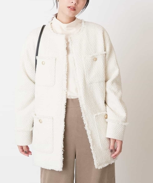 ◆今季トレンド!ツイード素材のオーバーサイズジャケット◆ 【デザイン】 一枚羽織るだけでトレンド感を高めてくれるツイードジャケット。 かっちりとした印象になり過ぎないように オーバーサイズに仕上げました。 凹凸感のある素材にゴールドのボタンで高見えする 今季イチオシのアイテムです。 【素材】 立体感のあるツイード素材で 秋冬らしいあたたかみがあります。 肉厚な生地で裏地も付いているので、しっかりと防寒もできます。 【スタイリングポイント】 ボウタイブラウスと合わせたきれい目なスタイリングはもちろん ロゴTやデニムなどのカジュアルアイテム合わせなど 着こなしの幅が広いアイテムです。 -------------------- ≪お気に入り登録機能の使い方≫ ■商品のお気に入り登録(ハートマークをクリック) 再入荷通知や値下げ等、お得なご案内を受けることができます。 -------------------- ※商品画像は、光の当たり具合やパソコンなどの閲覧環境により 実際の色味と異なって見える場合がございます。 商品の色味の目安は商品単体の画像をご参照ください。