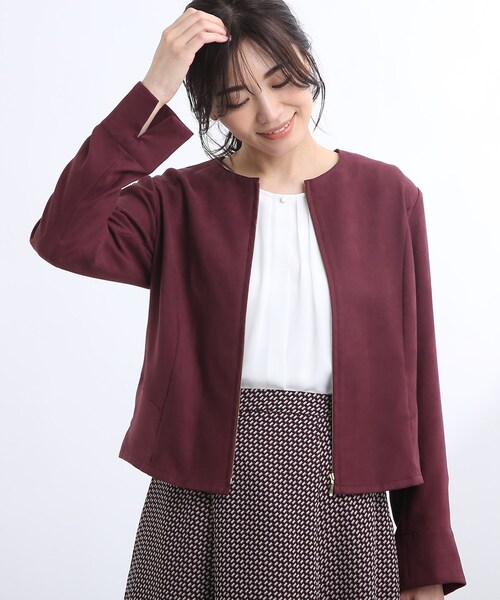 【デザイン】 カーディガン感覚で気軽に羽織れるスウェード調のジッパーブルゾン。 後ろ身頃から脇のウエスト部分の切り替えを斜めにすることでウエスト回りをスッキリさせ、細く見えます。 ワンピースやデニムパンツなど幅広いアイテムと相性が良く、キレイめからカジュアルスタイルまで大活躍してくれる一枚です。 ※ポケット数:横×2 【素材】 薄くて軽い、滑らかなタッチのスウェード調の素材です。 繊細な起毛感でパウダリーな表面感が特徴です。 ドレ―プ性があり、光沢をおさえた発色が上品な印象に仕上がっています。 ※裏地なし ※WEB限定サイズは一部店舗で展開する場合があります。 モデル情報:身長166cm B80 W59 H85 着用サイズ:09(M) 店舗へのお問い合わせ商品番号:101-45350 ●製品寸法: 07(S):着丈49cm B93cm 袖丈58cm 肩幅40cm 09(M):着丈50cm B96cm 袖丈58cm 肩幅40cm 11(L):着丈50cm B99cm 袖丈58cm 肩幅41cm 13(LL):着丈51cm B102cm 袖丈59cm 肩幅41cm 15(3L):着丈51cm B107cm 袖丈59cm 肩幅43cm 17(4L):着丈52cm B112cm 袖丈59cm 肩幅44cm 備考:重量:09(M)約210g(サンプル重量)