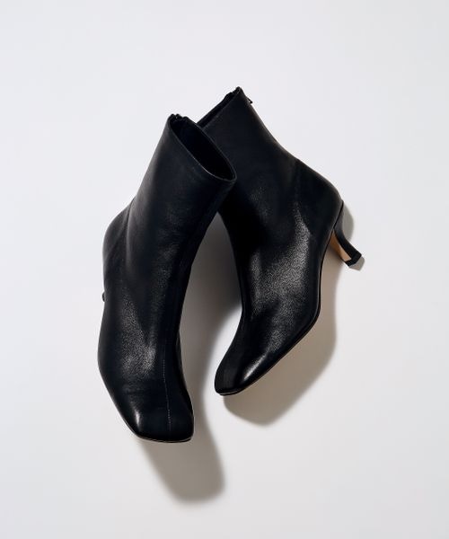 ーーー リアルレザーの上品ブーツに、モードなトウデザインをプラス。 リアルレザーのストレッチ素材のブーツは、履き心地が良く美しい。 バックZIPデザインで後ろ姿も手を抜きません。 トウデザインはワイドスクエアでモードに。 格好よくて上品な女性の足元を彩ります。 ーーー 【スタイリング】 どんなスタイリングにも合う、美しいシルエットのショートブーツです。 スカートの足元に添えれば洗練された女性を演出。 パンツに合わせると足先が見えてモードさが引き立ちます。