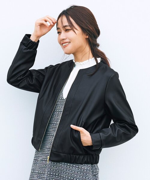 【デザイン】 ベーシックなノーカラーデザインのブルゾンです。 女性らしいスタイルにもより合わせやすいシンプルなデザイン。 ※ポケット数:横×2 【素材】 光沢感があまりない上品なフェイクレザーを使用しており、ソフトで滑らかな合皮なので着やすい一着となっています。 ※裏地あり 【サイズ/シルエット】 ワンピースやスカートとの合わせにもピッタリな着丈設定にしており、シルエットもコンパクトめに仕上げました。 モデル情報:身長166cm B80 W59 H86 着用サイズ:02(M) 店舗へのお問い合わせ商品番号:768-45010 ●製品寸法: 01(S):着丈45cm B104cm 袖丈57cm 肩幅36cm 02(M):着丈46cm B107cm 袖丈57cm 肩幅37cm 03(L):着丈47cm B110cm 袖丈58cm 肩幅38cm 04(LL):着丈48cm B113cm 袖丈59cm 肩幅39cm 05(3L):着丈49cm B116cm 袖丈60cm 肩幅40cm 備考:重量:02(M)約570g