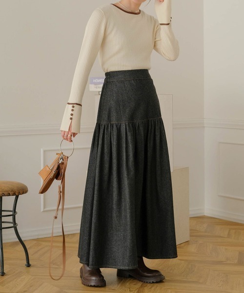 ●Bab●■POINTギャザーのボリュームが素敵なデニムティアードスカートです。軽いデニム生地を使用しているので、動くたびに揺れたり、広がる雰囲気がとても素敵です。切り替え部分のステッチは配色を使用しており、細やかなアクセントになっています。秋冬のお洋服に使いやすい、ブラックとインディゴ2色でのご用意です。■FABRICオールシーズン着ていただけるライトオンスのデニム生地を使用しています。綿素材なので、静電気も起きにくく履いていただき易いです。■COORDINATEピッタリめのニットはもちろん、ボリュームニットやシャツなど、トップスは選ばずに使用いただけます。厚い時期は半袖やノースリーブなどと合わせても、スカートのボリュームが際立って素敵です。…………………透け感:なし裏地:なし…………………※撮影環境により、多少実際のカラーと異なる場合がございます。また、携帯やスマートフォン、パソコンなどの画面上と実物では多少色が異なって見える場合がございます。ご了承下さいませ。※画像の商品はサンプルのため、実際の商品と若干仕様が異なる場合がございます。(必要であれば入力)※濃色品は、過度な摩擦や濡れた状態での摩擦により、色落ち・色移りをする恐れがあります。※この商品は、素材の特性上、洗濯の際に多少の縮みが生じる恐れがあります。洗濯後は形を整えてから干してください。※その他お取り扱いに関しましては、商品に付属のアテンションタグをご覧ください。★商品のお気に入り登録再入荷やラスト1点のお知らせ、セール情報などお知らせを受け取ることができます!★ブランドのお気に入り登録新商品や再入荷などのお得な情報を受け取ることができますので、是非ご登録ください。