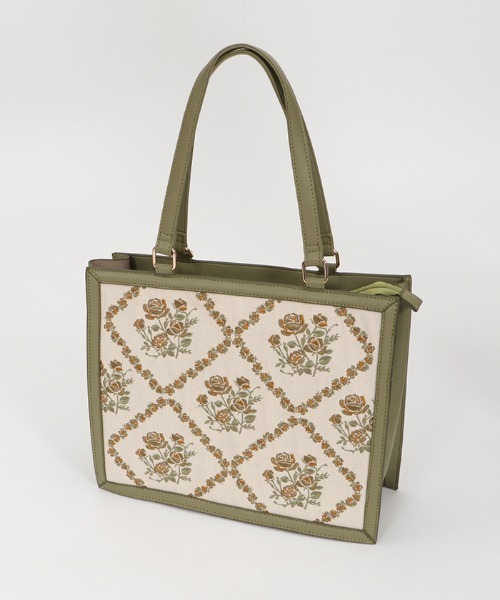 【アイテム説明】 タイル柄になった薔薇の刺繍がキャンバス生地にあしらわれたデザインがポイントのレトロガーリーな大きめトートバッグです。 A4サイズがすっぽり入るサイズ感になった実用性も高いバッグです。 【商品詳細】 開口縦×横:10cm X 28cm 内ポケット(個数):3 ※サンプルにて撮影のため、実際の商品と仕様、加工、サイズが若干異なる場合があります。