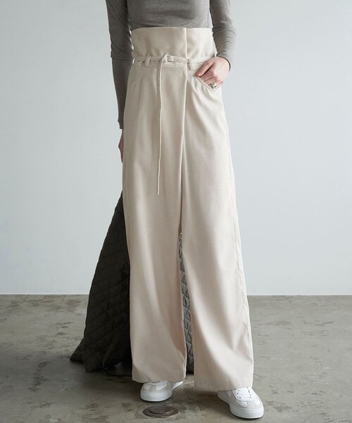 〈素材〉畝が細い、軽くて柔らかいコーデュロイ素材を使用透け感 : なし伸縮性 : なし裏地 : なし〈デザイン〉・大胆なハイウエストデザインが特徴のワイドパンツ・フロントの大きいタックデザインがシンプルながらもエッジを効かせている・ベルトをぎゅっと結びウエスト部分を折り返して、トップスをインするスタイリングもメーカー品番: 13110-7052