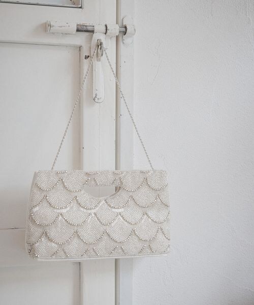 特別感のあるビーズクラッチ。 ビーズを一つずつ手縫いで縫い付け、繊細な手作業により仕上がった一点。 スカラップ調のモチーフでフェミニンさを出しつつも甘くなりすぎないように、メタリックなビーズを使い、大人な印象に仕上げています。 裏面は光沢感のあるサテン生地のみを使用し、大切なドレスへの引っかかったりを防ぐ配慮も。 取り外せるチェーンでショルダーユースもできます。 ドレスアップスタイルを華やかに盛り上げるクラッチバッグです。