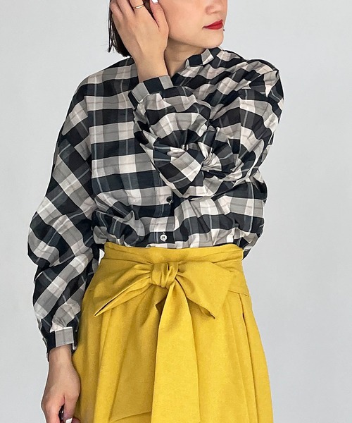 袖のツイストデザインがポイントのチェックブラウス。 ほんのりと透け感のあるチェック柄生地を使用し、 秋らしさもありながら今の時期から着れる涼し気な一枚です。 スキッパーデザインに前後差のある着丈、サイドスリット入りで、 スッキリとした印象に。 袖はツイストや袖口の内側部分にゴムを施す事で、 ふわっとした立体的なシルエットになっています。 アウトスタイルでさらりと着るのはもちろん、 ボトムインして女性らしいメリハリスタイルにも◎です。 ※撮影場所や明るさにより 実際の商品と色味が若干異なる場合がございます。 ☆商品のお気に入り♡登録を押せば ”再入荷通知”や”残りわずか通知” 値下げのお知らせが届きます! お気に入りのブランド登録していただければ新商品入荷のお知らせも届きますので 是非登録してみて下さい