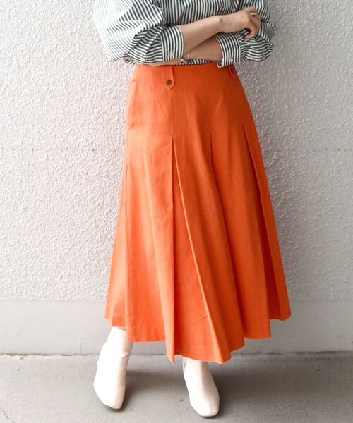 スカートのシルエットがとても綺麗なボックスタックスカート。 ベルトレスでウエスト周りがすっきりと見えるのも嬉しい◎ 〈ウォッシャブルアイテム〉 〈デザインポイント〉 前後にぐるりとボックスタック入れたクラシカルなデザインスカート。 素材がカジュアルなので、色んなアイテムと相性が良いです。 絶妙なミディ丈がロングブーツや、ショートブーツとも合わせやすく、重宝すること間違いなしです。 〈生地・素材のポイント〉 厚手のコットン素材に微起毛をかけたモールスキンを使用しています。 細かい起毛加工が施されており、肌触りが非常に滑らかなのが特徴的。 ツイルの組織がしっかりしているので、着用した時の表情に立体感があります。 ご自宅でお洗濯可能なので、デイリーにお使いいただけます。 〈コーディネート・その他〉 ウエストのベルトレスデザインを活かして、薄手のトップスなど裾をタックインする着こなしがおすすめです! BIGシルエットのトップスをアウトで合わせるのも可愛いです。 ------------------------------------- 生地の厚み:中間 伸縮性:無 透け感:無 光沢感:無 水洗い:可 -------------------------------------- 〈モールスキン別アイテム〉 スクエアネックワンピース→724-54-0054 ポケットワンピース→724-54-0053 ※モールサイトによって(ハイフン/-)抜きでの品番表記となります。 ※汗や雨等の水分や摩擦により、他の衣類に色移りする場合がありますので、淡色衣類との組み合せはご注意ください。 ※着用、洗濯時のスレで表面が毛羽立ち白っぽくなる場合がありますのでご注意ください。 ※濡れたまま放置すると、他のものへの色移りや、色泣きする場合がありますのでご注意ください。 ※屋外での撮影画像は、光の当たり具合で色味が多少異なって見える場合があります。商品の色味は、スタジオでの詳細画像をご参照ください。 ※末永く愛用頂く為に、アテンションタグ・洗濯ネームを必ずご確認の上、着用又はお取り扱い下さい。 ※画像の商品はサンプルです。 実際の商品と仕様、加工、サイズが若干異なる場合がございます。