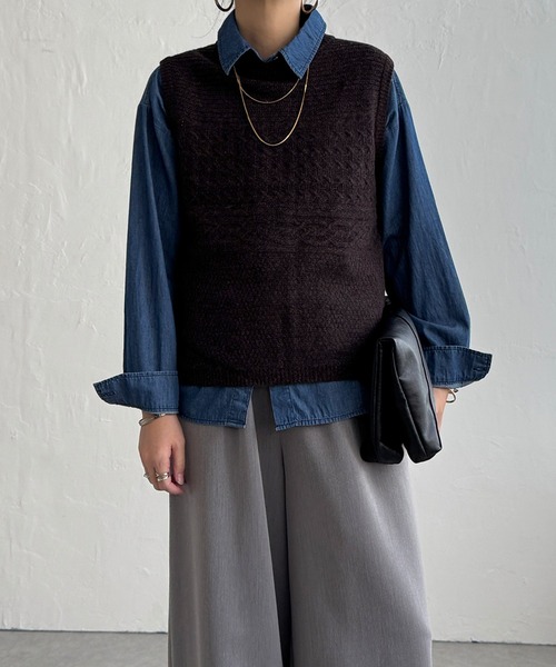 今年もトレンドとなっている、後ろリボンのニットベスト。 LBC で人気の定番アイテムです。 【素材】 ラムウール混であたたかみのあるニットです。 【デザイン】 胸元にケーブル柄を切り替えました。 【ポイント】 バックシャンでヌケ感のある、LBC 定番人気ベスト。 リボンはボタン使いなのでスタイルに合わせて外すことも可能です。 ブラウスと着合わせをしやすいようネック部分のボリューム調整し、より着やすくなりました。 [クリーニング] 手洗い可、ドライクリーニング可(F)、ウェットクリーニング(W)