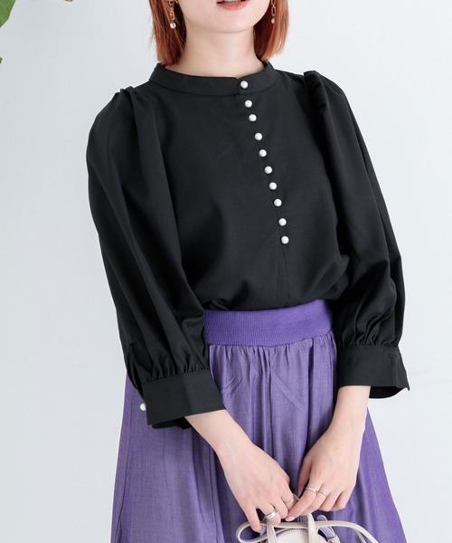 パールボタンが上品なボリュームスリーブプルオーバー。○POINT・華やかさと上品さを兼ね備えたフロントのパールボタンデザインが魅力的。(上から7つめまでは開閉が可能です。)・ネック、肩、袖口にギャザーが配されており、ナチュラルなドレープのボリュームスリーブデザイン。・晩夏からお召いただき易い七分袖仕様です。○STYLING・スリットパンツと合わせればクールなお仕事スタイルに。・ボリュームスカートにインすれば涼しげなお出掛けスタイルに。裏地:なし光沢:微光沢伸縮性:あり透け感:ホワイトのみややあり生地の厚さ:普通ポケット:なし