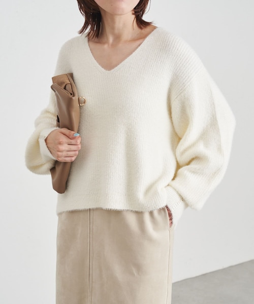 ★「着痩せ」を叶える!季節感と華やかさをプラスするフェザーニット●ふわふわもこもこの柔らかい肌触りが楽しめる、 保温性が高いニット。●表目と裏目が交互に編まれている、立体的なボリューム感の畔編みが、体のラインをカバーしてくれます。●緩やかに胸元が開いたVネックニットは、着ぶくれせず、デコルテラインをすっきりと華奢に演出。●ほのかな女っぽさも漂わせてくれる、すっきり見え確実。●シンプルなボトムスとも相性抜群の、秋冬欠かせない1枚です!【COORDINATE】【MATERIAL】#オフィスカジュアル#きれいめコーデ#大人カジュアル#オンオフ