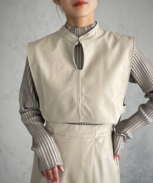 1点で洒落見えするスタイルが完成する一品 トレンドのレザーショートベストはコーデのアクセントに。 ワンピースやシャツの上から重ねるだけでワンランク上のスタイリングに。 カーブを描いた胸元のカッティングと表面感のあるソフトな質感が女性らしい印象を与えてくれます。 ネックはスタンドカラーにすることでモード感をプラスしました。 サイドベルトは取り外し可能で2way仕様です。 同素材のレザーマーメイドスカート(988-61601)とセットアップでの着用もおすすめです。 ------------------------------------------------------ 透け感/なし 光沢感/多少あり 伸縮性/なし 厚 み/★★☆☆☆ ------------------------------------------------------ 【お買い物を楽しんで頂く為に】 ■商品のお気に入り登録 お気に入りの登録をして頂きますと 完売カラーの再入荷通知や、ラスト1点の通知を受け取ることができます。 ■ブランドのお気に入り登録 新商品の発売や再入荷、タイムセールやクーポン発行のお知らせなど &g'aimeがお届けするお得な情報を受け取ることができます。