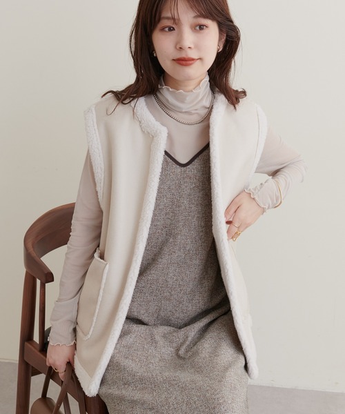 【2022AW natural couture】秋冬のコーデに欠かせないボアアイテムがトレンドのベストで登場■Design フェイクレザーとボア使いのリバーシブルデザインのベスト。メンズライクにも着こなせる1枚です。しっかりとした生地感なので、ニットに合わせてもおすすめのアイテムです。■Stylingボリュームのある生地感ですが、ミドル丈でベルトにしてはやや長めなので全体のシルエットは縦長に見え、着太りして見えずらいのもポイントです!ワンピースに合わせて1枚合わせて頂くとトレンド感のある着こなしになります。ハイネックニットやカットソーに合わせて、大人っぽくこなれ感あるスタイリングにして頂くものおすすめです◎■Fabricリバーシブルで着用頂けるので、コーディネートに合わせて着回し頂けます。ボアのボリューム感も程よく着ぶくれしにくいです。カラーリングは、アイボリーとブラウンの2色でご用意しております。肩幅:43cm=========================透け感:なし裏地:なし(リバーシブル)伸縮性:なし光沢感:フェイクレザー部分はあり生地感:やや厚手========================= 【お気に入り登録でお得な情報がいっぱい】・「商品のお気に入り登録」で再入荷通知や、ラスト1点の通知、セール通知をいち早く受け取ることができます。・「ブランドのお気に入り登録」で新商品や再入荷など、お得な情報を受け取ることができます!※店舗の入荷時期は商品によって異なります。店頭の在庫状況につきましては各店舗にてお問い合わせください。