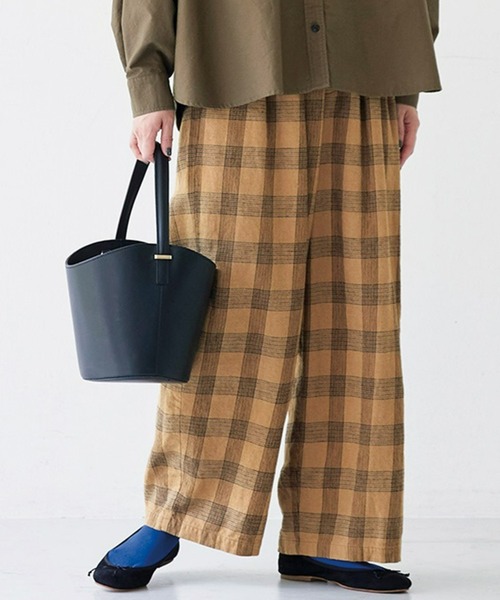 秋色グレンチェック。 15番手の太めの綿麻糸で織り上げた、素朴な風合いのチェック生地で作ったパンツ。 秋らしい茶色ベースのグレンチェックがほどよく華やかな印象です。 ウエストゴム仕様で、ゆったりとリラックスできるはき心地に仕立てました。 同じ生地で作ったワンピースと合わせてセットアップも楽しめます。