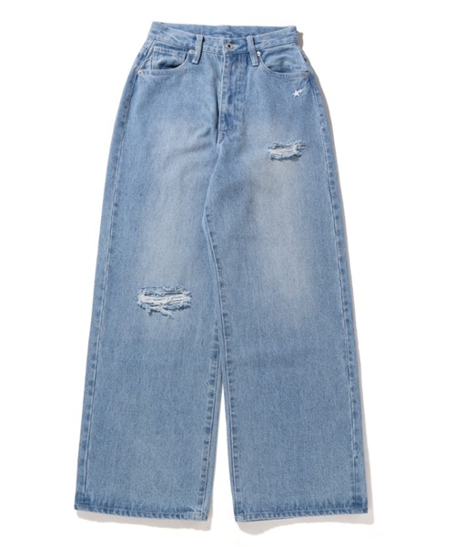 NEW ARRIVAL! 12oz.のオリジナルデニムを使用したハイウエスト仕様のデニムパンツ。右腿、左膝にダメージ加工、右ポケット下にSTA・背面ポケット左右にAPE HEADのエンブロイダリーを施したデザイン。右ヒップポケット縁にピスネーム、後部右ウエストにレザーパッチを付属。袋布にオリジナルのヘリンボーンカモスレキを使用。腿・膝下から太さを増すバギーシルエット。ワンウォッシュ。2色、レディース2サイズ展開。