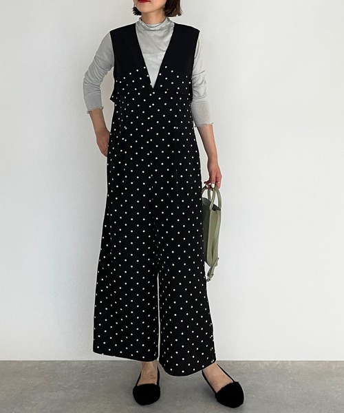 一枚で華やかスタイルが叶うオールインワン。 柔らかくさらりとしたドット柄の生地を使用し、 上身頃はブラック無地、切替えでドット生地をドッキングした 華やかな一着です。 スッキリとしたフロントVラインから 切替え部分にフリルデザインをプラス。 ワイドシルエットでゆったりとした着心地もポイントです。 キャミソール、チューブトップ等ですっきりと着るのも、 薄手のインナーやコンパクトなTシャツなどの合わせも◎です。 デイリー使いはもちろんですが、 インナーや小物次第でオケージョンやお呼ばれコーデとしても活躍できるアイテムです。 ※裏地あり ※撮影場所や明るさにより 実際の商品と色味が若干異なる場合がございます。 ☆商品のお気に入り♡登録を押せば ”再入荷通知”や”残りわずか通知” 値下げのお知らせが届きます! お気に入りのブランド登録していただければ新商品入荷のお知らせも届きますので 是非登録してみて下さい