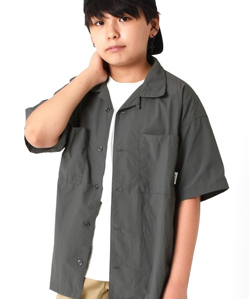 ナイロンリップ生地を使用したオープンカラー半袖シャツです。大き目のポケットがトレンド感満載!表面に格子状の織柄が薄く入っているリップストップ生地は、その丈夫さから登山用品やアウトドアウェアなどでよく使われています。沢山着てガシガシ洗えるのもポイント!大人っぽい着こなしを楽しんでください♪【ポケット】胸ポケット×2【モデル】身長147cm、体重34kg 着用サイズ:150cm(クロ)身長146cm、体重41kg 着用サイズ:150cm(グレー)