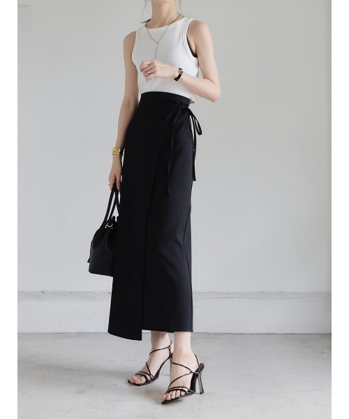 自身でウエストに巻き付けて仕上がるラップスカート。ラフなリボンがポイント。リボンを通す穴が2つあるのでウエスト調節も可能なアイテムです。シンプルなので、すべてのトップスに合わせやすいアイテムとなっています。