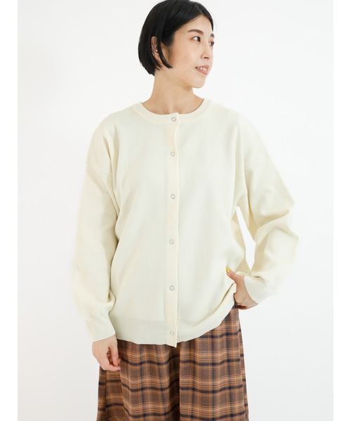 ドットボタンがレトロな雰囲気を演出するニットカーディガン。肩落ちのドロップショルダーは、丸みのある女性らしい印象をプラスします。ボディラインを拾いにくいゆったりとしたシルエットも魅力的◎シンプルなデザインで着まわしやすく、デイリーユースなアイテムです。※商品画像は、撮影環境やお客様のご利用のPC・スマートフォンのモニター環境などにより実物と色味に差異がある場合がございます。