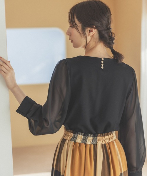 袖シフォンが軽やかなデザイントップス。 ネックの金ボタンが後ろ姿にも華をプラスしてくれます。 普段使いからオフィスまで、どんなシーンにも合うキレイな一枚。 季節の代わり目にちょうどいいアイテムです。 ーーーーーーーーーーーーーーーーーーーーーーー ▼ 商品のお気に入り登録 ▼ 完売カラーの再入荷通知や、ラスト1点の通知、 セールの通知も受け取ることができます。 ▼ ブランドのお気に入り登録 ▼ 新商品や再入荷など、 ブランドのお得な情報をいち早くお知らせ! ぜひご登録ください! ※屋内外の光や照明の当たり具合で、実際の商品の色味とカラー別画像の色味に違いが発生する場合がございます。 色味はスタジオ撮影の詳細画像にてご確認ください。 ※生地の寄り画像が最も実物に近い色味となります。