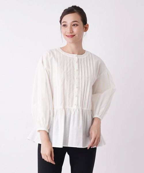 ウエストからヘムにかけてふんわり広がるペプラムやプリーツタックのフロントが大人可愛いノーカラーブラウス。 上品なパールボタンもこだわりを感じさせるディテールとなっています。 細身のパンツとシンプルに着こなすだけでも、ワンランク上のコーディネートが完成するトップスです。 ------------------------------------ <着用シーズン>秋・春 <伸縮性>なし <透け感>色によりあり <ポケット>なし <生地の厚さ>薄手 <お取扱い方法>ウォッシャブル(手洗い可)、ドライクリーニング <裏地>なし ------------------------------------- ※商品の色味は、撮影場所や光のあたり具合などにより色味が違って見える場合が御座います。また、お客様のお使いのPCのモニター環境などにより色味が違って見える場合が御座います。予めご了承の上ご注文下さい。